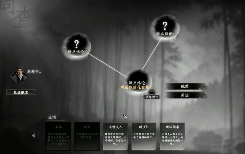 通过调查得知,无惜夫人是食用含砒霜的桂花糕致死,而周诺则是被殴打后触发鹤顶红毒发。玩家需要前往药铺与掌柜对话,了解到花容楼的人购买过砒霜,而鹤顶红则是大家族特有的毒物。根据这些线索,玩家需要推理出整个事件的真相。