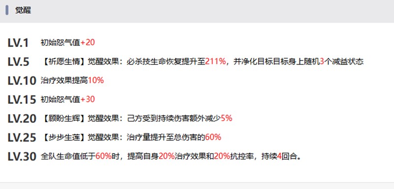 觉醒1级时初始怒气值增加20点,让赫兰能更快释放必杀技;觉醒5级时生命恢复量提升至211%,还能净化目标身上随机3个减益状态;觉醒10级时治疗效果再次提高10%;觉醒15级时初始怒气值再增加30点;觉醒20级时持续伤害减免额外增加5%;觉醒25级时转化治疗量提升至60%;觉醒30级时全队生命低于60%会提高自身20%治疗效果和20%抗控率。