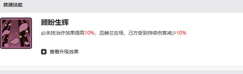 她的普通攻击顾盼生辉也很实用,这个技能不仅能使必杀技的治疗效果提高10%,而且在赫兰在场的情况下,己方全体成员受到的持续伤害会减少10%,大大增强了团队的生存能力。被动技能摇曳生姿触发后,将为自身带来生命上限提高15%、攻击力提高10%以及治疗效果提高10%的全方位属性提升。
