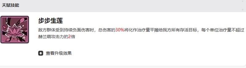 天赋效果步步生莲是赫兰的核心特色之一,当敌方群体受到持续负面伤害时,总伤害的30%将转化为治疗量,平摊分配给我方所有存活目标。这个机制巧妙地利用了敌人的攻击来反哺我方,实现了资源的高效循环利用,每个单位获得的治疗量不会超过赫兰基础攻击力的2倍。