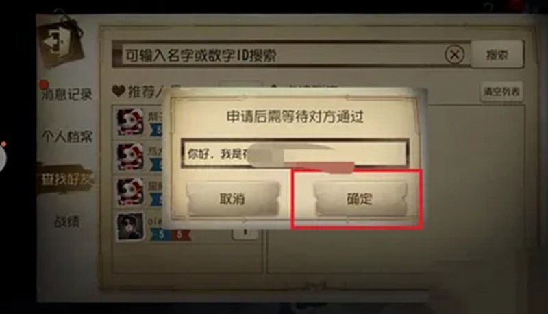 进入第五人格游戏大厅后,点击右上角的社交图标,选择好友功能按钮。在打开的好友界面中输入对方的ID号码,或者在左侧列表中找到想要添加的好友直接发送申请。这种方式特别适合现实中认识的朋友互相添加。