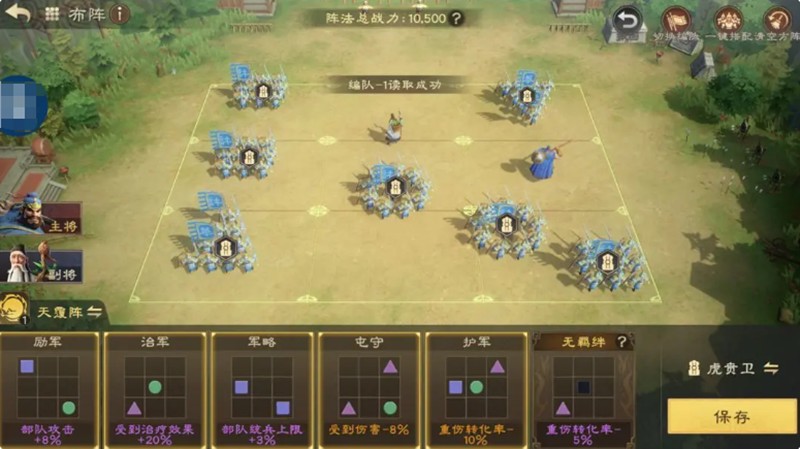 阵法选择对华佗的战力发挥至关重要,天覆阵是首选阵法,其技能释放后的概率治疗效果能与华佗的主动技能形成完美配合。如果没有天覆阵,长蛇阵也是不错的替代选择,虽然防御加成略低但获取难度较低。