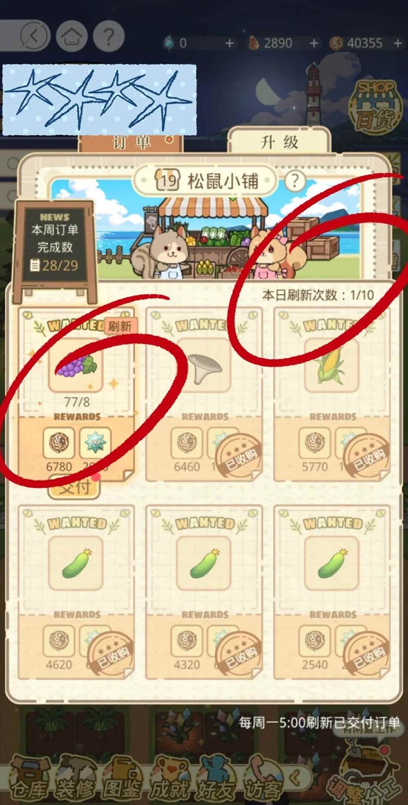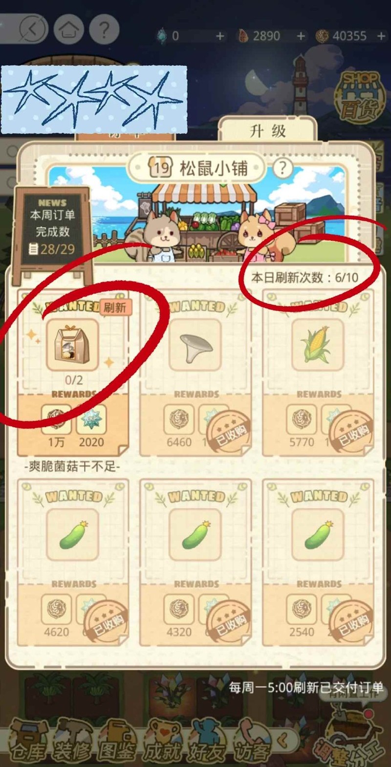 升一级之后会送大概一万币,不用太担心升级之后没钱,升完级之后会解锁小铺升级,小铺升级会解锁更多的售卖,如果没有已经种好的可以点刷新,每天可以刷新十次,可以刷到有货为止(有一定赌的成分)