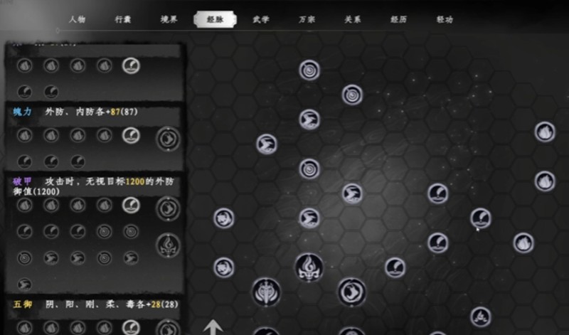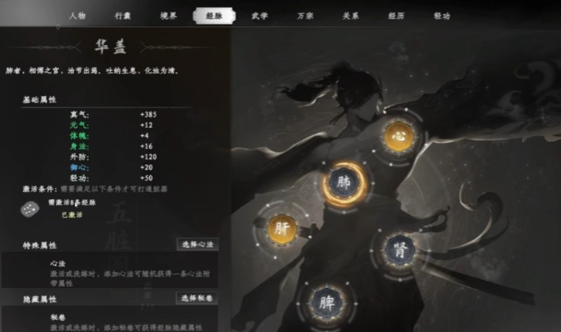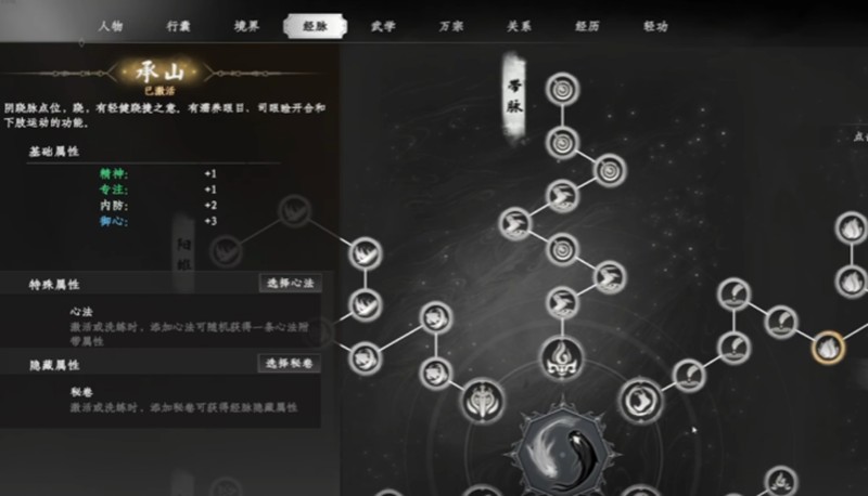 运行周天之前需要先激活经脉穴位。玩家点击屏幕右侧的江湖按钮打开角色界面,再点击上方的经脉按钮即可进入经脉页面。页面中会呈现奇经八脉的完整分布,从每条经脉的尾部经脉点开始依次激活。每成功激活一个普通经脉点,玩家可获得相应的经脉加成点数,而激活中心经脉点获得的加成点数更多。