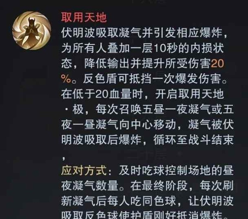 图1老二的同色球是旧机制,属于那种打的快无人在意,打的慢就很要命的,对赛季初自强感觉挺重要,这里也叭叭一下。首领攻略里对应的描述是图2机制[取用天地],简单来说就是吃球用反色盾抵挡凝气的爆炸,否则易伤并减输出