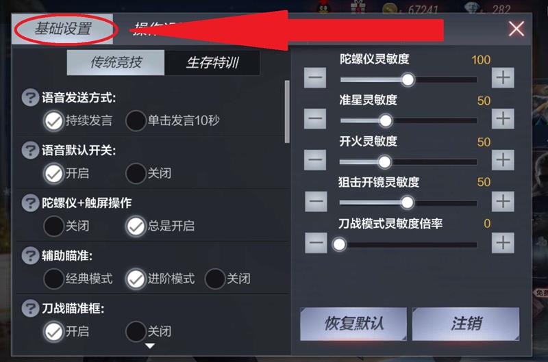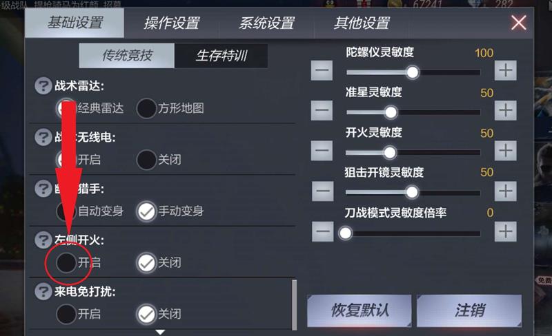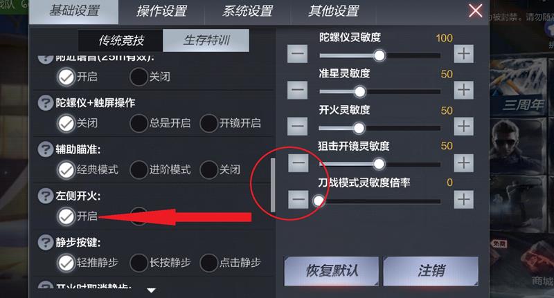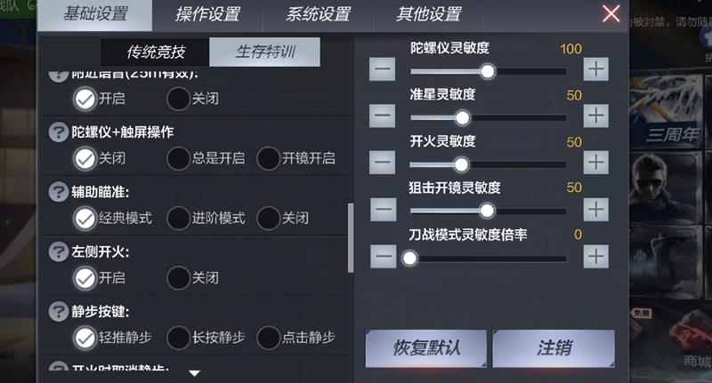 在设置页面中可以看到多个选项,找到并点击”基础设置”选项。在基础设置界面中,分为”传统模式”和”生存特训”两种模式设置,两种模式都需要分别设置左侧开火功能。