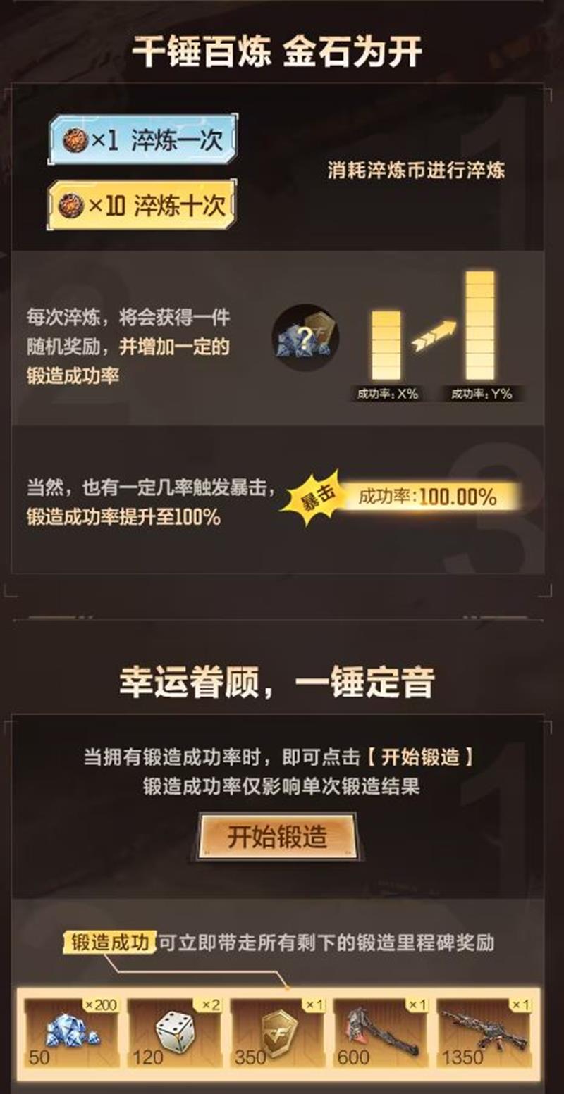 锻造系统是这次更新的一大亮点,玩家可以通过消耗淬炼币进行淬炼,每次淬炼都会获得随机奖励,并增加一定的锻造成功率。当锻造成功率达到100%时,玩家可以点击“开始锻造”按钮,锻造成功后即可获得对应的武器。