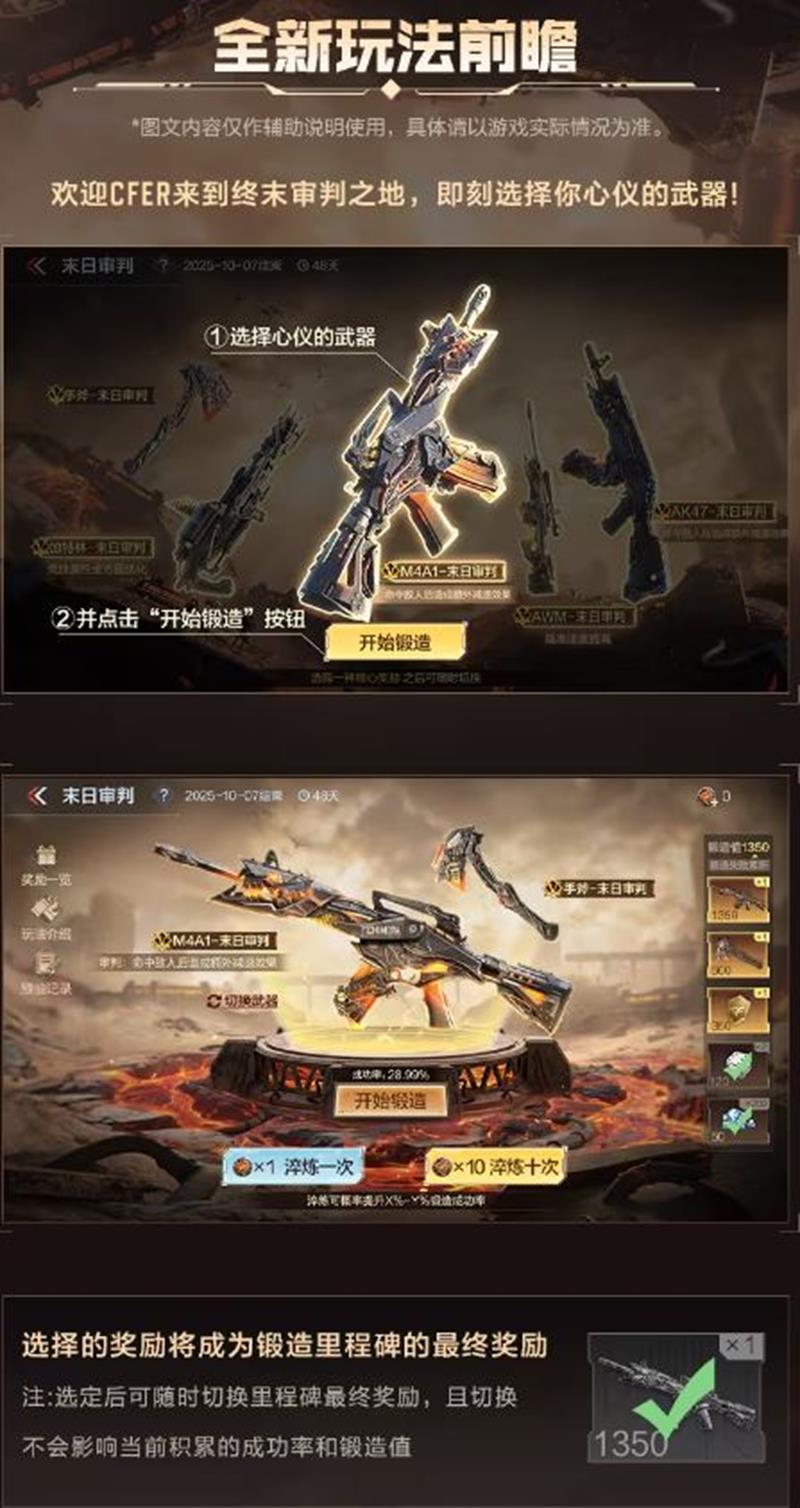随着新武器的上线,CF手游还推出了全新的玩法,让玩家能够更深入地体验末日审判系列武器的魅力。玩家可以在游戏内选择心仪的武器,并点击“开始锻造”按钮进行锻造,以提升武器的性能。