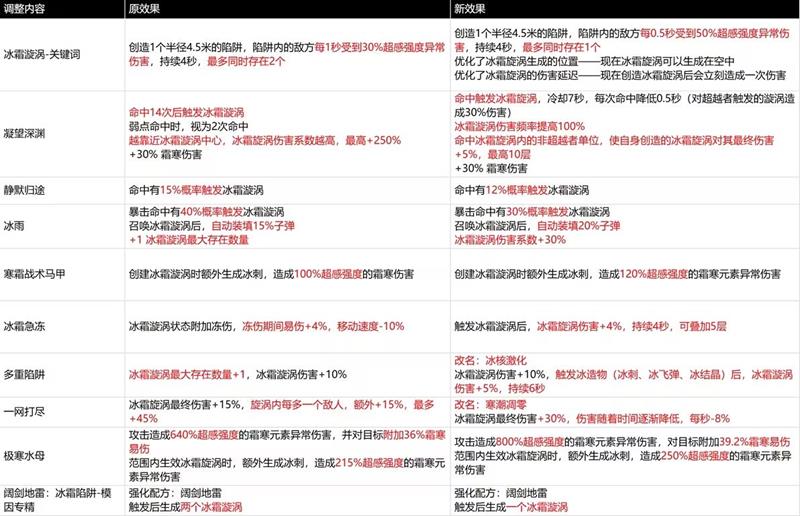 3)提高单个冰霜漩涡的伤害数值,单个漩涡即可超过此前三个漩涡的伤害;对应的,我们略微下调了冰系枪械的触发冰霜漩涡的频率。这一调整综合提升了冰霜漩涡的伤害效率,缩短了伤害启动时间。