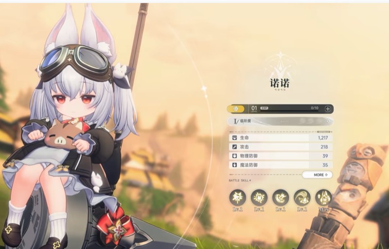诺诺在蓝色星原旅谣中的造型十分可爱,银白色双马尾搭配兔子耳朵和防风镜,穿着黑白连衣裙,怀里还抱着小猪造型的宠物。虽然外表看起来像个小朋友,但作为三星角色,她的战斗力相当出色。诺诺的生命值高达60255点,攻击力39点,物理防御36点,魔法防御39点,综合战斗力达到4143点,这些数据表明她在战场上有着不容小觑的生存和输出能力。