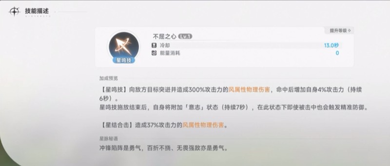 不屈之心作为莉莉的星鸣技能,使用后会向前方目标突进,造成300%的风属性物理攻击。命中敌人后,莉莉的攻击力会提升4%,持续6秒。技能结束后,她将进入持续7秒的意志状态,在此状态下可以施展精准防御。
