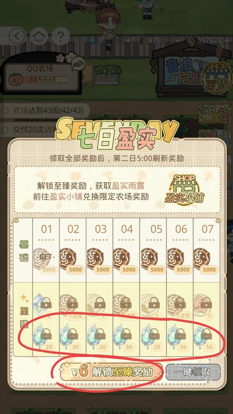 ②6r:在七日盈实处氪6r,签到7天可得200雨露+2北极星+2能量棒+1鲜花饼+3万农场币