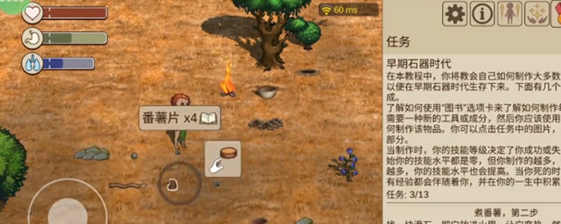 在石器时代阶段,玩家首要任务是解锁挖掘棍的制作方法。随后可以研究扁食类别,制作番薯片等食物来增加饱腹感。除了这些基础食物外,玩家还可以制作其他多种食物,研究方向上没有太多限制,玩家可以根据自己的发展需求选择研究方向。
