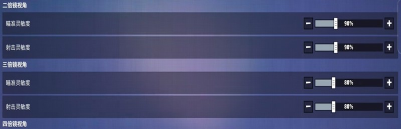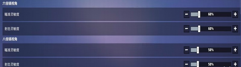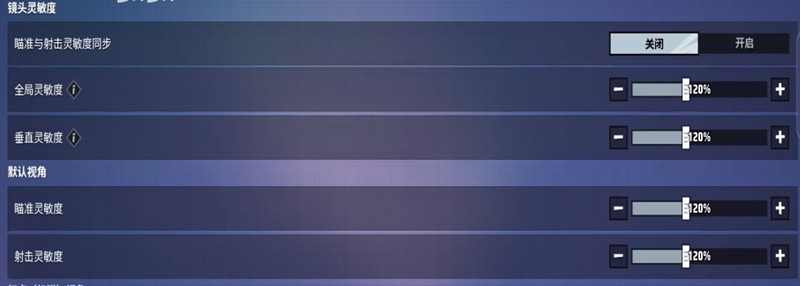 镜头灵敏度的调整分为几个部分。首先需要关闭瞄准与射击灵敏度同步选项。全局灵敏度和垂直灵敏度建议调整到120%。默认视角下的瞄准灵敏度和射击灵敏度也同样设置为120%。不同倍率镜头的灵敏度需要分别设置:红点镜设置为90%,二倍镜90%,三倍镜80%,四倍镜70%,六倍镜60%,八倍镜50%。