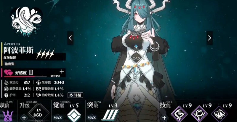 魔物女王是被动技能,能够使阿波菲斯自身释放的侵蚀状态概率增加24%。侵蚀状态的强度和回合数会随着卡牌的突破和觉醒而提升。该技能没有冷却时间,但觉醒后可以获得两项加成:一项是额外回血效果,另一项是在敌人处于异常状态时为全队提供额外增伤。