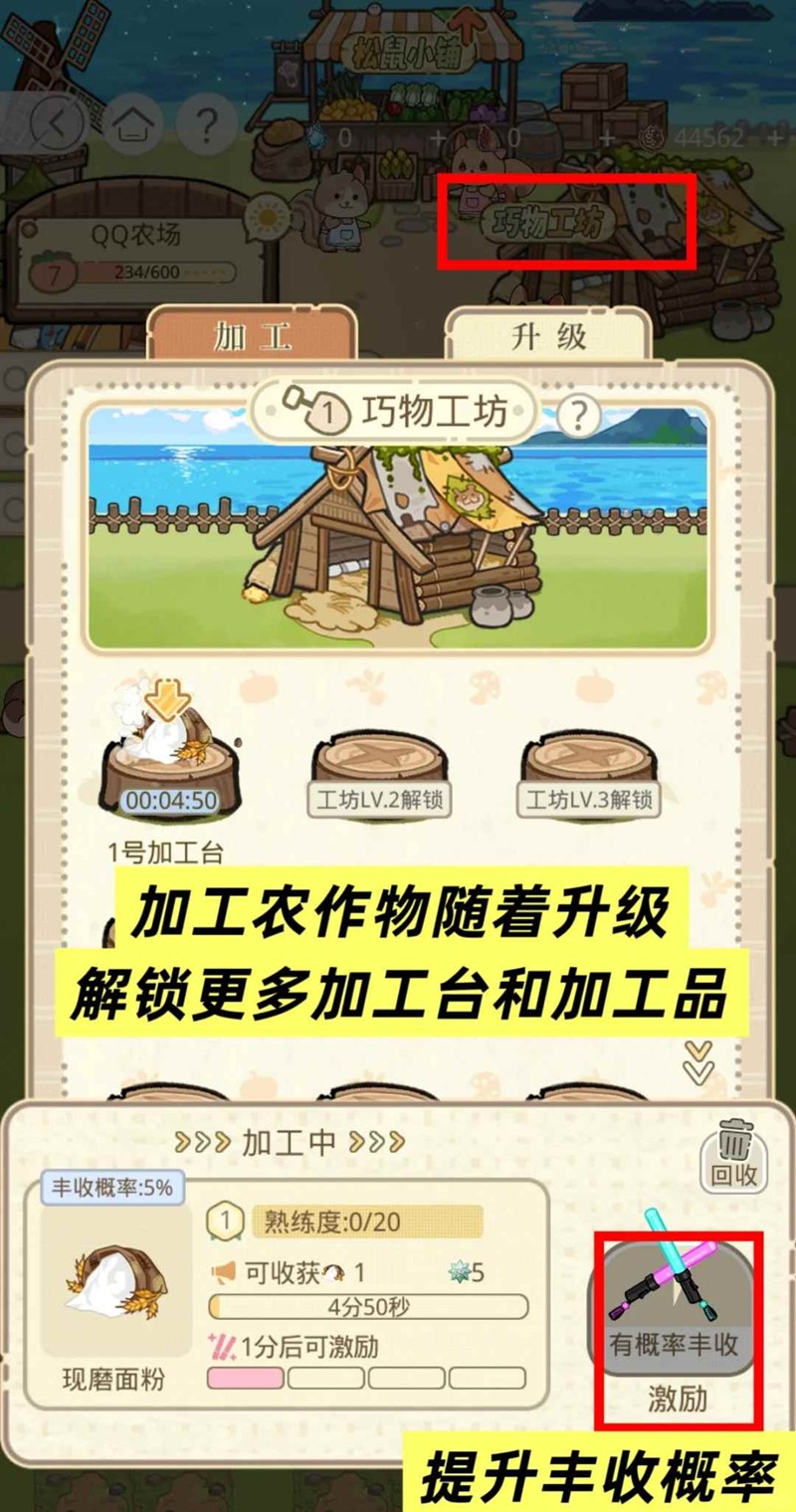 工坊等级提升,可解锁更多加工台,同时加工更多物品