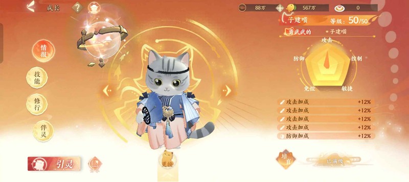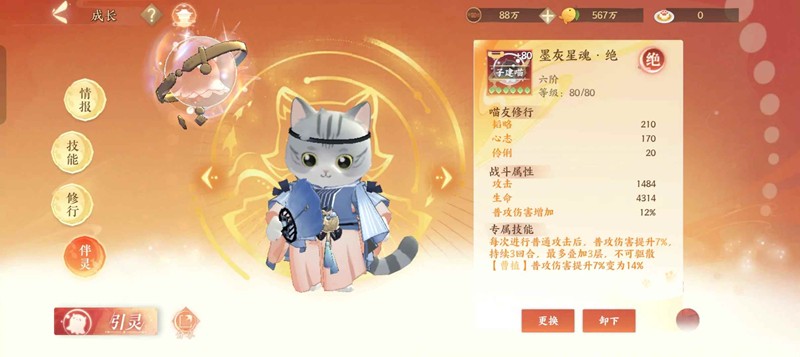 能够尽可能多的触发追击,武器全部洗暴击强度,面板暴强达到270-280即可,猫技能选择猫一“七步”增加追击概率