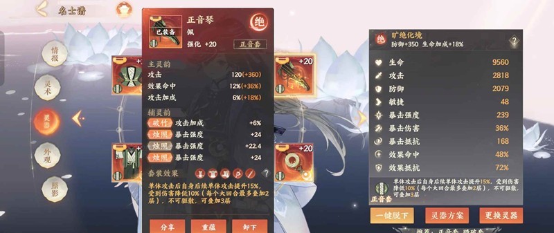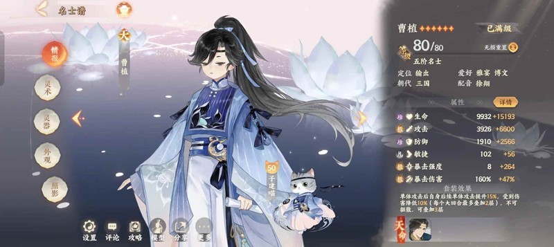 装备方面推荐正音/踏破,我比较推荐正音,因为曹植是完全坐地的,有正音的减伤存活率会高一些,猫词条选择4攻击加成1防御加成的原因也是为了让曹植尽量活的久一些