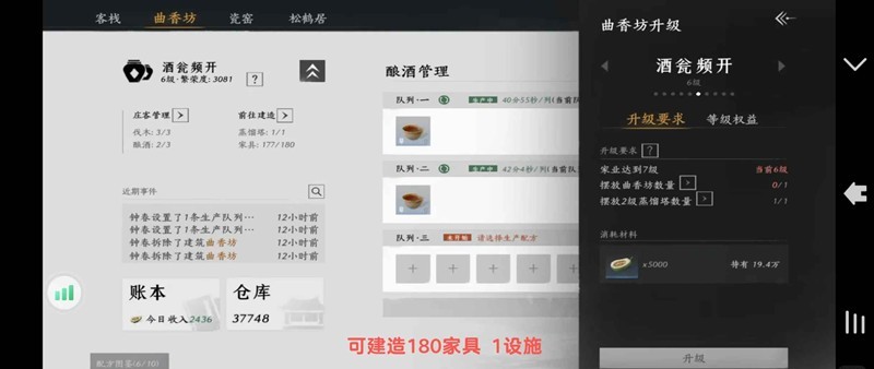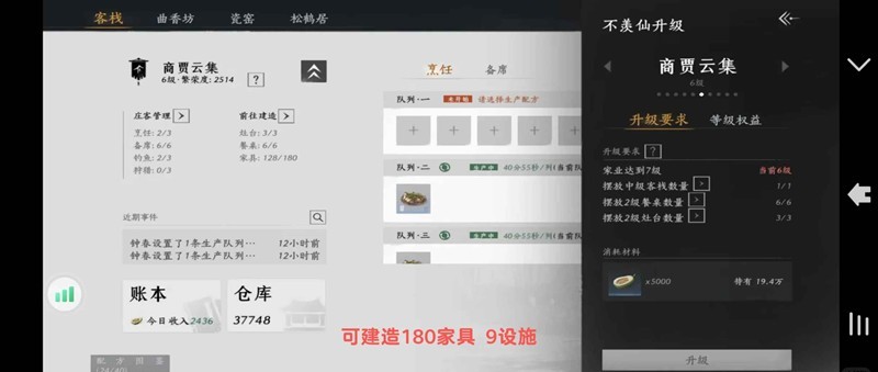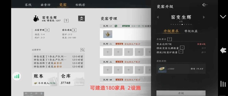 不羡仙、曲香坊、瓷窑各可建造180个家具(含房屋、结构、装饰) 升级需5000囤囤粟