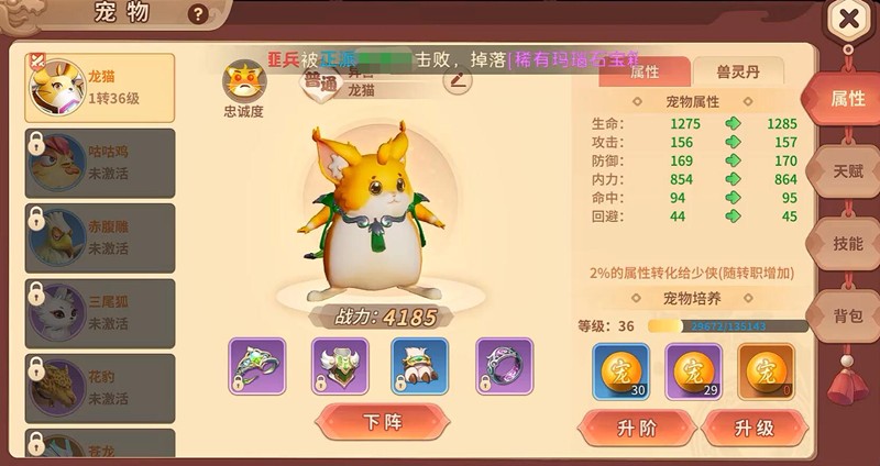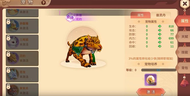 游戏中有四种主要宠物,分别是龙猫、赤腹雕、花豹和黄寅虎。花豹的致命链接天赋能让单体攻击职业获得群攻伤害效果,而黄寅虎的战意威慑可以降低目标攻击力。宠物升级可以通过打怪或使用升级丹来实现,随着等级提升,生命、攻击、防御等基础属性都会得到增长。