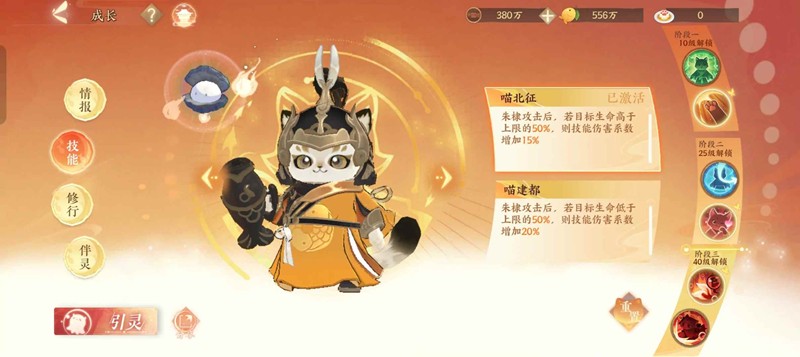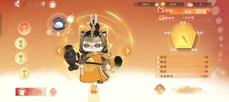 忘川四周年庆典天卡是输出定位的永乐大帝—朱棣,养成参考如下: 装备推荐踏破或者离火(个人试验过两种装备搭配感觉踏破更好用一些),猫词条选用敏捷猫,我这里补了一条12%攻击加成,为了搭配整体配速。因为朱棣只有一颗真元,所以九世灵一定选择黑曜,可以最大程度吃满伤害加成。
