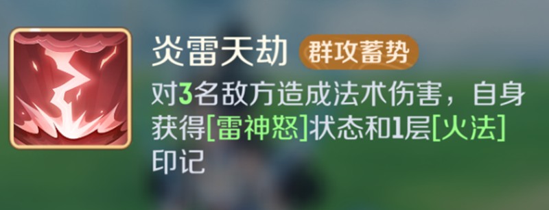 九龙冰封是一个兼具控制与输出的群体水伤技能,能够攻击四个目标并对主目标造成额外增伤效果。使用后同样会为天宫添加一层水法印记。炎雷天劫作为蓄势待发的群攻技能,可以对三个目标造成法术伤害,并赋予天宫雷神怒状态,同时叠加一层火法印记。