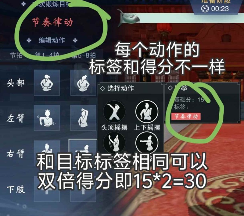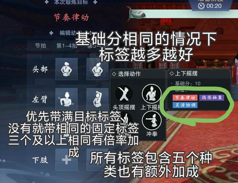 选择动作和目标标签相同会双倍得分,并且三个及以上相同标签会有倍率加成,所以优先拿目标标签的情况下可以多带相同的标签(每个动作得分和标签是随机的)