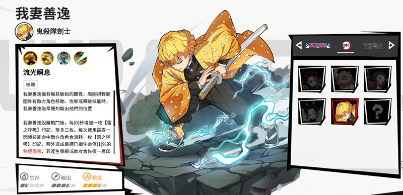 漫画群星大集结的我妻善逸怎么样?很多玩家在挑选刺客型角色时都会关注到我妻善逸的强度表现,整理了一下漫画群星大集结中我妻善逸的技能机制和实战表现,其实这个角色在机动性和爆发方面都有不错的表现,下面我们一起来看一下漫画群星大集结我妻善逸的详细强度分析。