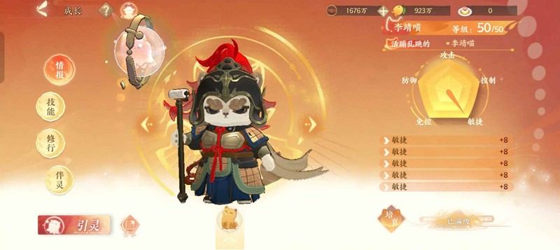 我这里因为没用黑曜,武器洗敏捷的话230+暴强容易白字,所以干脆武器洗了双风华,最后面板暴强达到了5+339,敏捷在鞋子和猫属性的支撑下也来到了129+108=237的数值,而且攻击力搭配苍灰也比较可观,虽然不是最完美的李靖但是拳拳到肉的伤害也很刺激。大家可以根据自己需要的属性灵活调整搭配即可。