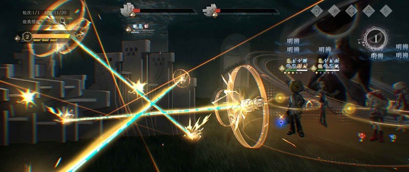 打掉一个精灵随机给装置加一格灵光,满三格给我方群体大炮,每回合结束敌方给我方单体两炮,充能完毕的回合在回合结束时打我方群体大炮,打掉一个装置时立刻给我方眩晕