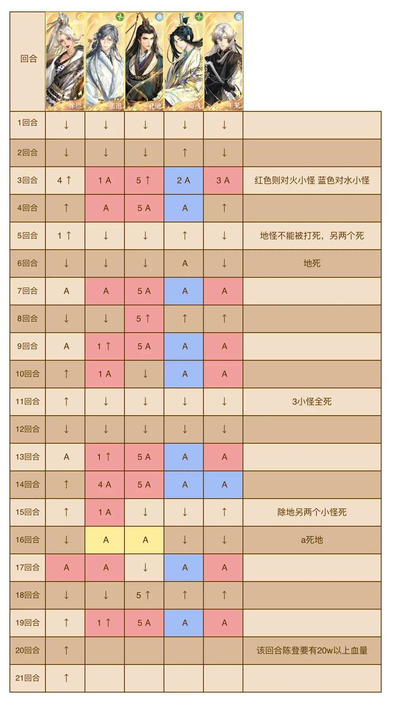 跟打表中的颜色仅供参考,只需记得全程不打地怪,打火和水怪,将两小怪血量压到ee最后一个大放大能打死即可