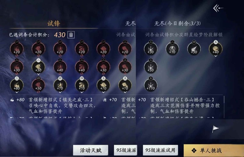 首先词条如图所选,核心要素是不要选倒数第二列的砸陨石和倒数第四列的狮子从天而降,430分以上的技能循环很容易这俩技能同时出现,移动端视角比较难看全场,一个迷糊就会刚躲完狮子跑进陨石正中心嘎嘣没了。其他词条看个人躲技能熟练度。