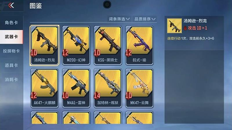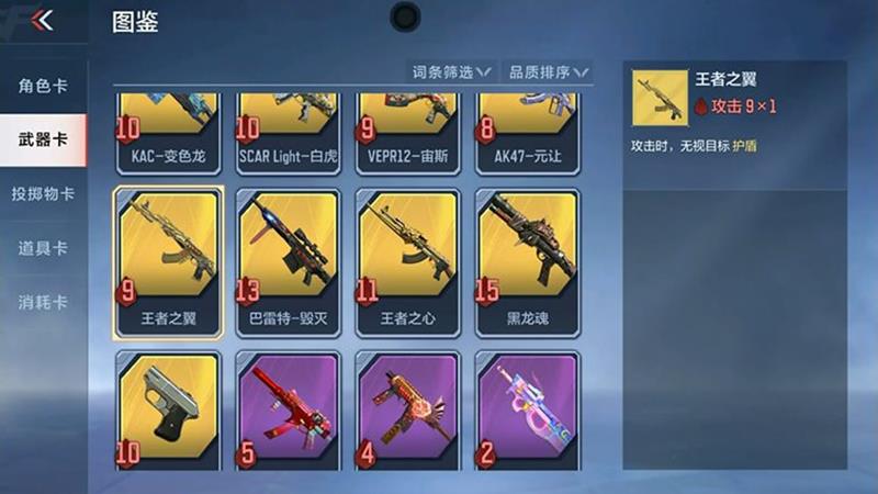 装备牌主要可以分为三种,包含武器卡、投掷物卡和道具卡。武器卡自然是各类武器,包含各类步枪、狙击枪等,但不同枪械类型有着不同效果,其中步枪大多是对敌人角色牌前排的敌人进行攻击,而其它枪械卡牌能攻击到后排。不同品质武器牌除了攻击数值加成外,被动能力也有区别,金色卡牌往往拥有针对效果极强的特殊能力,而其它品质武器牌均为数值加成。