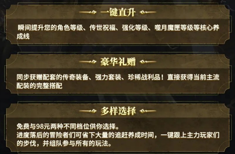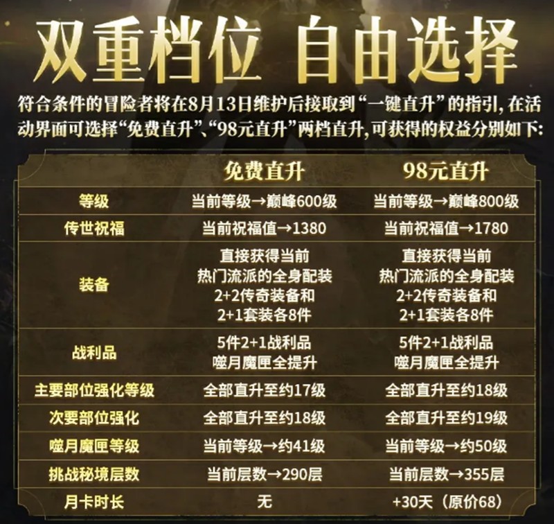 本次活动的核心内容是让符合条件的角色通过直升机制快速提升至巅峰等级。玩家在满足等级要求后,可以选择不同的直升档次进行提升。免费档可以让角色直升至巅峰600级,并解锁主流装备和配件,同时传世祝福、强化等级等养成系统也会同步提升。而收费档价格为98元,角色可以提升至巅峰800级,除了基础装备外,还会获得更高级的套装和珍贵道具,让玩家在游戏中的起步更加顺利。