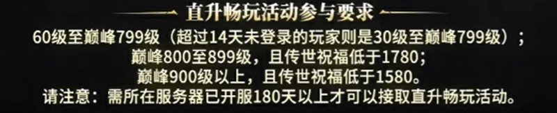 参与活动的条件根据玩家类型有所不同。对于新玩家来说,角色等级需要达到60级才能参与。而对于回归玩家,系统会放宽限制,只要角色等级在30级以上即可参与活动。需要注意的是,每个账号只能选择一个角色参与此次直升活动,不能多个角色同时使用该功能。此外,活动期间玩家可以根据自身情况选择合适的直升档次,无论是免费还是收费档,都能获得不错的资源和装备。