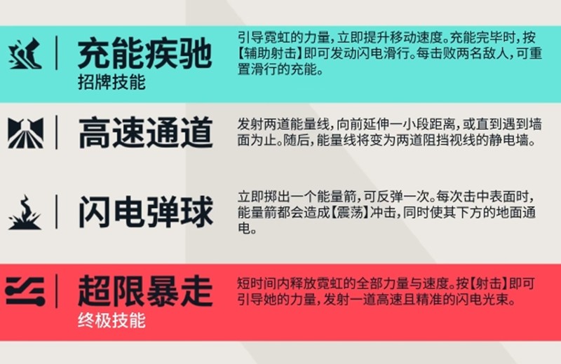 超限暴走是霓虹的大招,激活后她将释放出高伤害的闪电光束,同时重置闪电滑行的充能次数。这使得她在大招期间可以更频繁地进行位移,提升战场生存能力和输出效率。在团战中,建议优先击杀低血量敌人,这样可以延长技能持续时间,让她在战场上持续压制对手。同时,利用加速效果抢占关键位置,为团队创造优势。