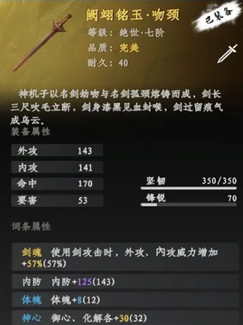 阙翊铭玉吻颈是一件绝世品质的装备,融合了神兵的设计理念。它由名剑劫吻与孤颈熔铸而成,外观漆黑如墨,属性方面也十分全面。外攻和内攻威力提升57%,内防增加143,同时还提供体魄、御心、轻功等多方面的加成。由于其强大的属性,这件装备在交易市场上的价格高达49729,成为许多玩家梦寐以求的毕业装备。