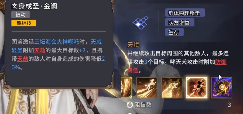 被动技能方面,“肉身成圣”在激活哪吒图鉴时增加“天劫”状态的目标数量,同时减少受到“天劫”敌人20%的伤害,提升了战场生存能力。“护法神犬”则让哮天犬的每次攻击为杨戬提供伤害加成,最多叠加三层,进一步强化了他的持续作战能力。