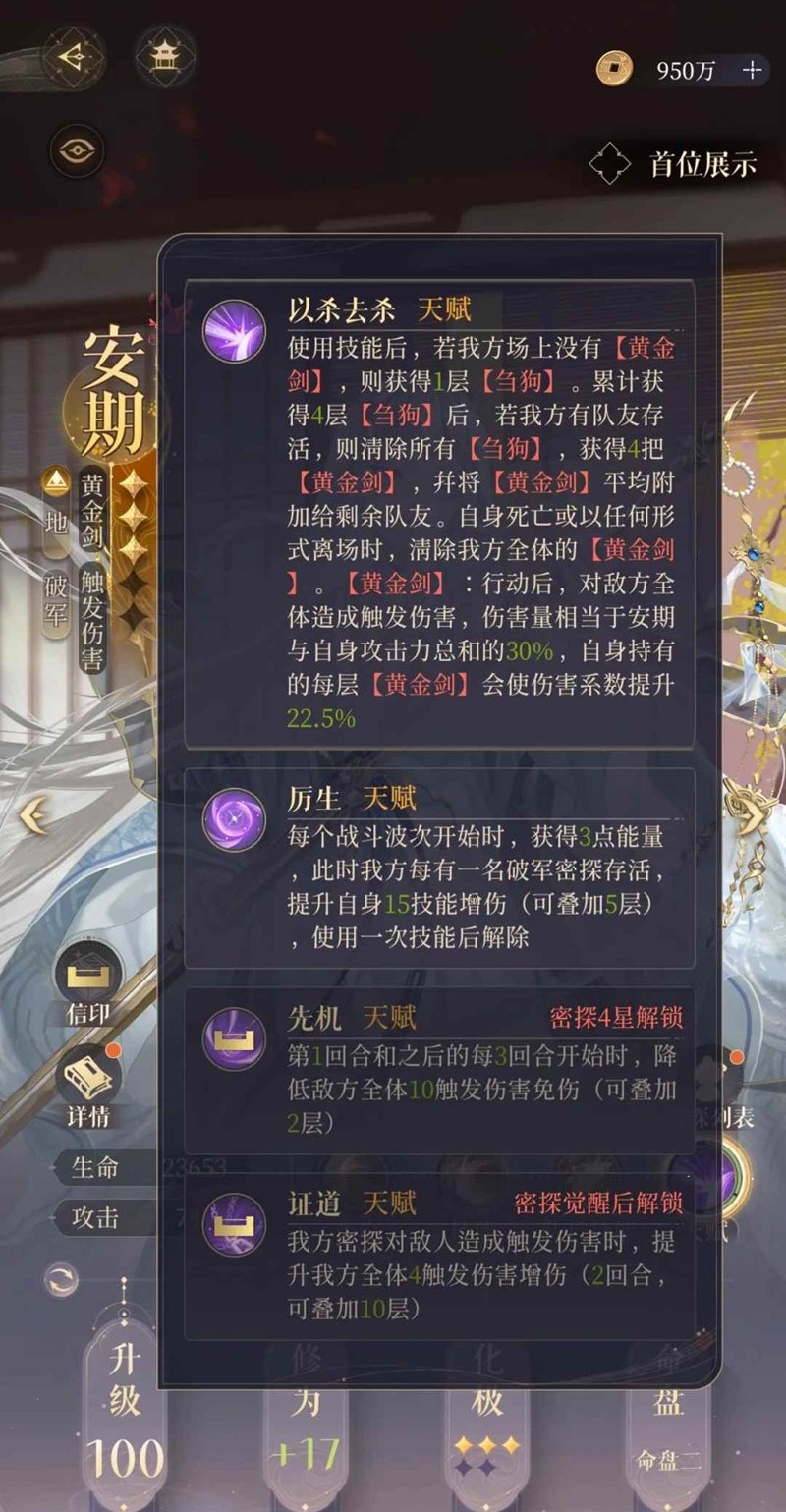 一星天赋降低全队密探50%的治疗效果,再叠加自身扣血机制。一星凌统经常会还没有撑到队友献祭,自己已经无了的情况。