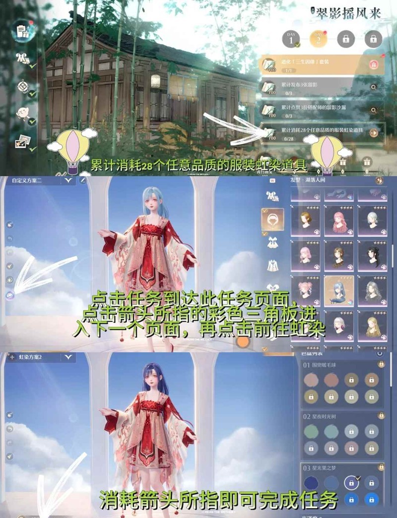 点击任务到达此任务页面点击箭头所指的彩色三角板进入下一个页面,再点击前往虹染,消耗箭头所指即可完