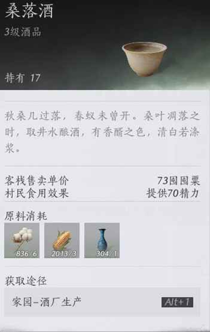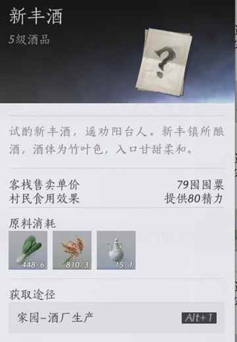五级家业有5个备席依旧猛卖酒就完事,5级酒(79)和3级酒(73)差距不大。酿酒三个位置可以考虑2个酿3级酒清库存材料,1个酿5级酒。后续材料多了全力酿5级酒。