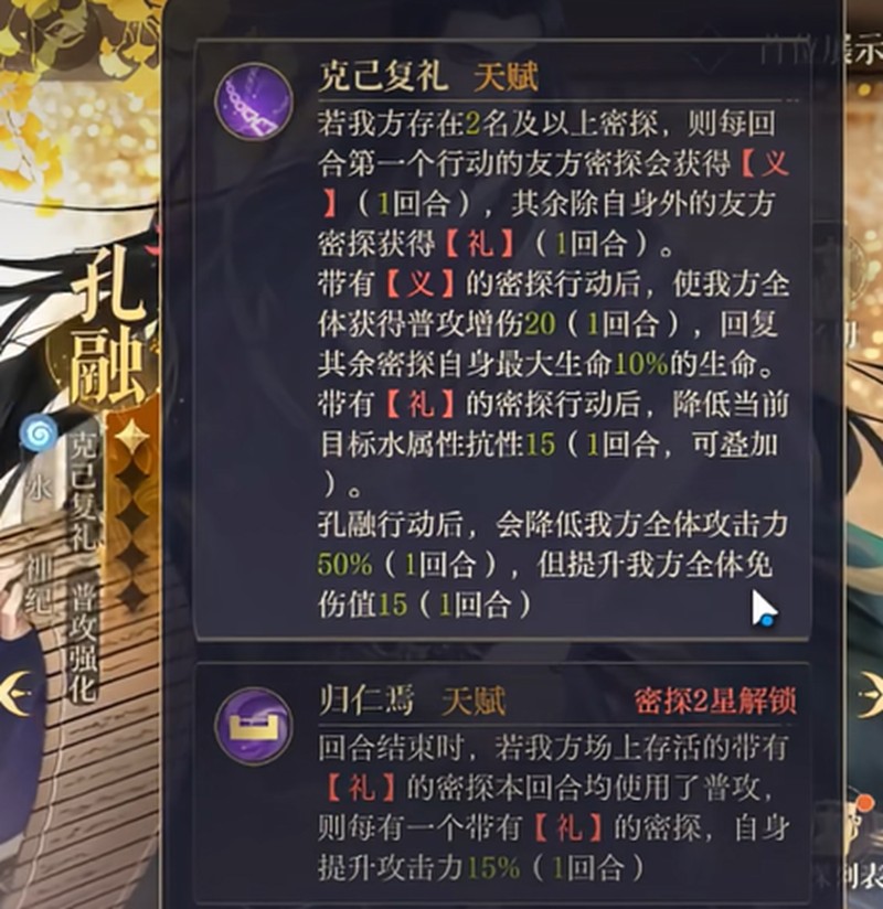 天赋技能”克己复礼”是孔融的核心机制,可以让队友获得”义”和”礼”两种状态。”义”状态能让队友行动后为全队提供普攻增伤和生命恢复,”礼”状态则可以降低敌方水属性抗性并叠加。这两个状态能在战斗中持续存在,逐步改变战局走向。