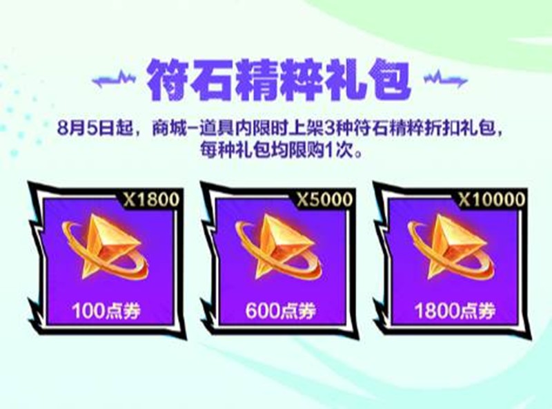 符石精粹礼包:8月5日起,商城-道具内限时上架3种符石精粹折扣礼包,每种礼包均限购1次。