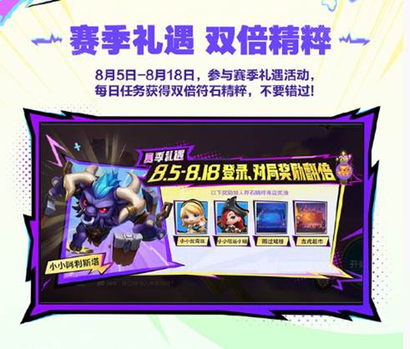 赛季礼遇双倍精粹:8月5日-8月18日,参与赛季礼遇活动,每日任务获得双倍符石精粹,不要错过!