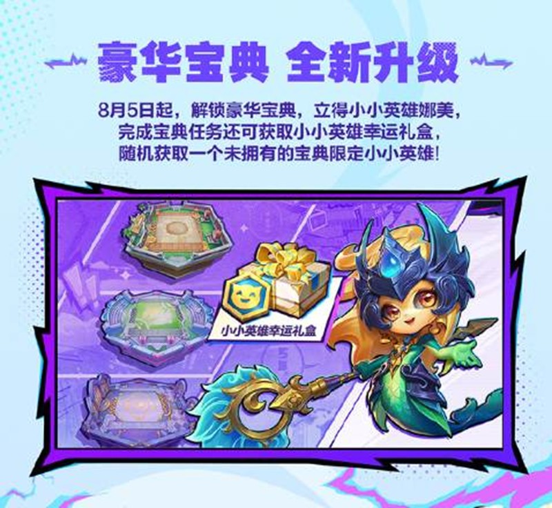 豪华宝典全新升级:8月5日起,解锁豪华宝典,立得小小英雄娜美,完成宝典任务还可获得小小英雄幸运礼盒,随机获取一个未拥有的宝典限定小小英雄!