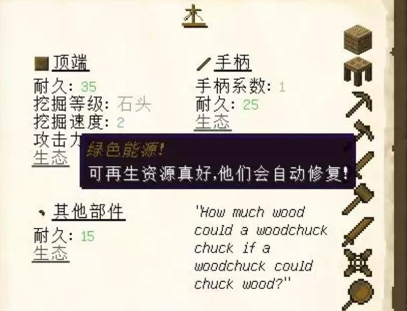 最后将这些部件放入工具装配台就能组合成完整的工具。不同材料制作的部件会赋予工具特殊属性,比如木质手柄能获得”生态”效果,可以自动恢复耐久度。
