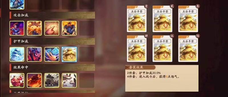 五谷丰登:开局增加三点怒气,加速全队爆发无中生有:自身行动时有概率回复2点怒气,根据角色自身速度进行选择
