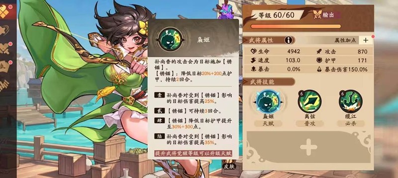 火攻:开局稳定爆发,压低敌方血量给关羽或者徐盛创造收割机会万箭齐发:每次攻击概率附加额外真实伤害,上限较高但并不稳定需要一定的运气