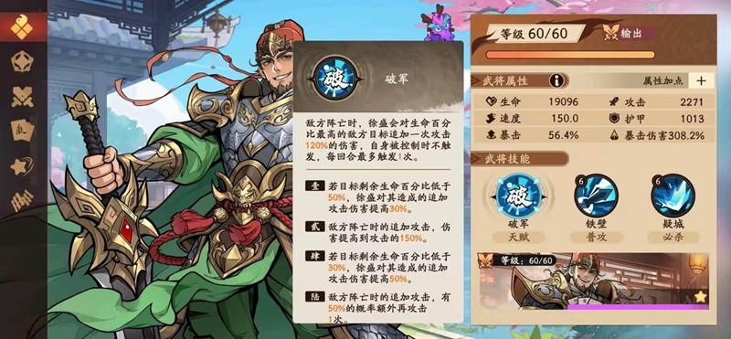 天赋破军:敌方阵亡时徐盛可以进行一次追加伤害,造成高额伤害,且高命后有概率额外追加一次