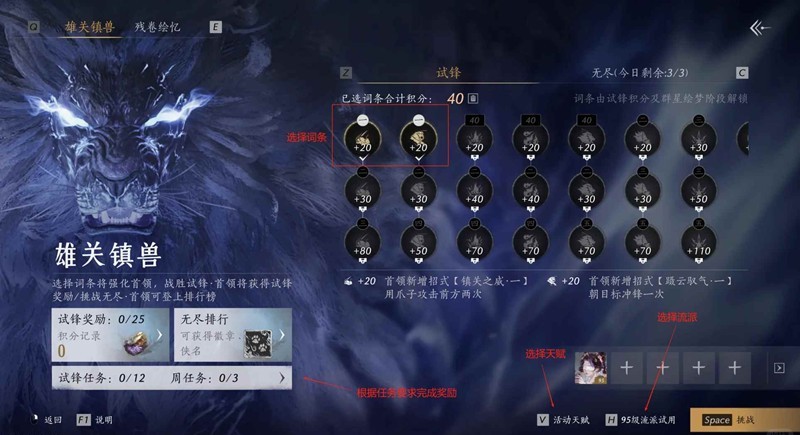 ③试锋没有时间限制可以慢慢打,无尽boss打不死尽力输出就行,每日挑战上限3次限时3分钟,根据输出和词条选择结算积分
